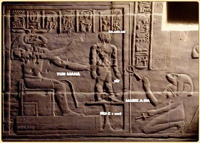TURA MAHA = h : symbole de sa chaise .Avec l’index et le majeur de l’autre main, recherchez le pouls ( RIS ) V : symbole à genou gauche A-NA-MARIE la transcription de tous leurs gestes en hiéroglyphe BAS sacré